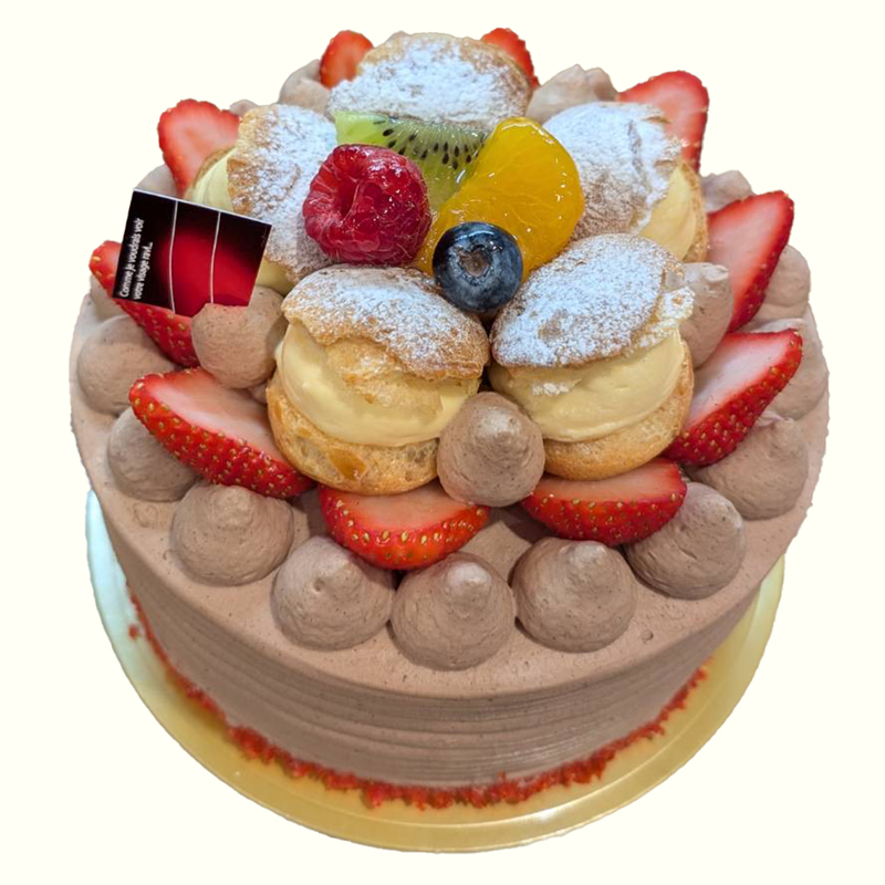 タルト生地の上に、カスタードクリーム、苺と生クリームをサンドしたスポンジ、季節のフルーツ、 周りにカスタードを絞ったプチシューを飾り、かわいらしく仕上げました。
