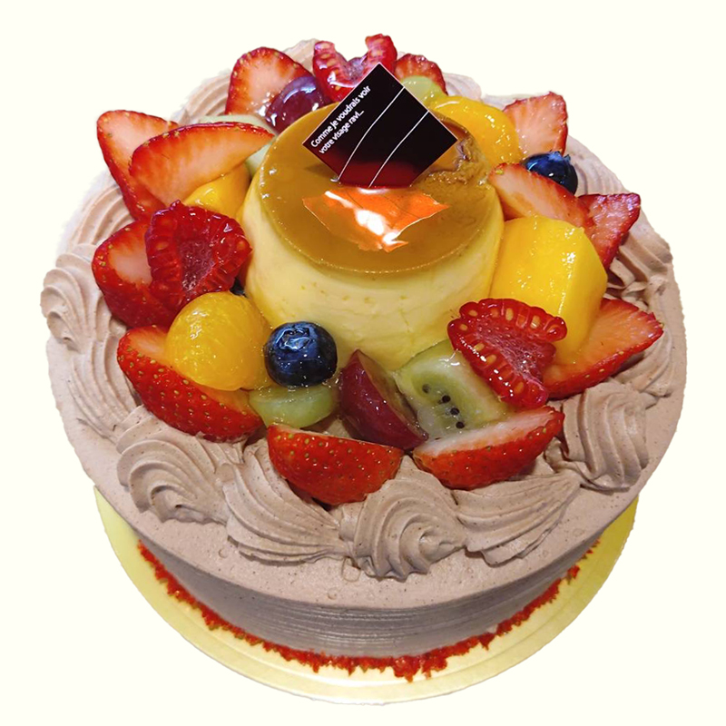 人気のプリンをケーキの真ん中に乗せ、周りにフルーツを飾りました!